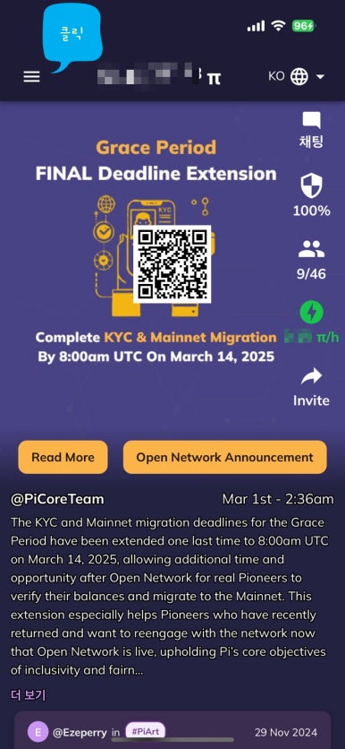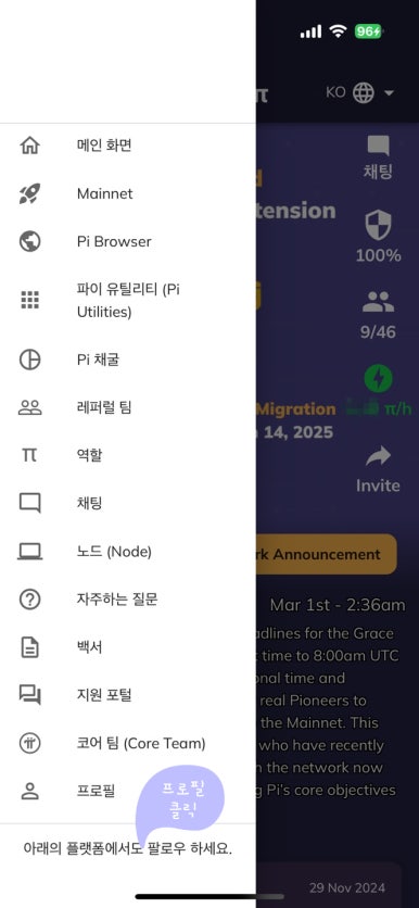 - 메인넷으로 마이그레이션 (KYC 인증후 됩니다 최소 30회 이상의 파이 채굴을 완료하면 됩니다)