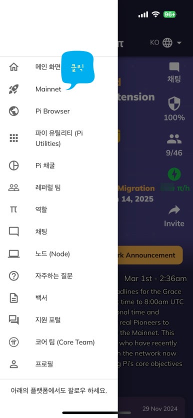 파이코인 실행후 좌측 메뉴를 클릭하십니다.