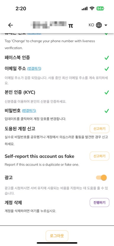 파이코인 30회 이상 채굴 하게 되면 KYC(본인인증) 하라고 하는데 그부분은 다음으로 넘어 가셔도 됩니다.