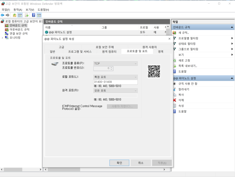 돋보기(찾기) - 제어판- 고급설정 - 인바운드 규칙 (우클릭) - 새규칙만들기 - 포트 - 다음 - TCP - 특정 로컬 포트 - 31400 - 31409 - 다음 - 연결허용 - 다음 - 이름 (파이노드 포트 설정) 저장 완료