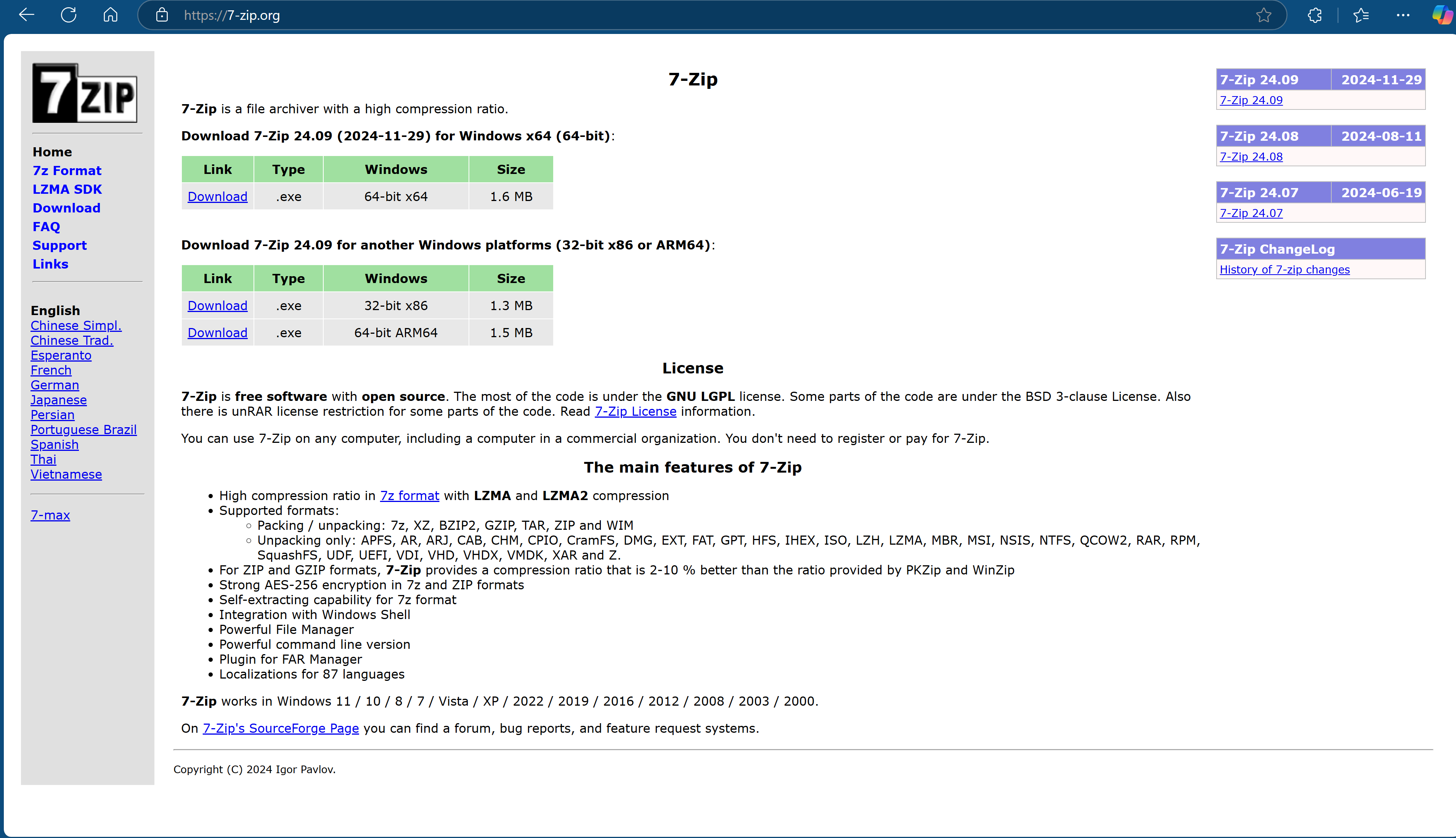 https://www.7zip.org 7-Zip7-Zip 7-Zip is a file archiver with a high compression ratio. Download 7-Zip 24.09 (2024-11-29) for Windows x64 (64-bit): Link Type Windows Size Download .exe 64-bit x64 1.6 MB Download 7-Zip 24.09 for another Windows platforms (32-bit x86 or ARM64): Linkwww.7zip.org 윈도우 압축프로그램 사용하면서 7zip 프로그램이 매우 압축률도 좋고 사용하기 매우 편리합니다. MS-DOS 시절 기억하시는분들은 아실지 모르겠지만PKZIP PKUNZIP ARJ LHA ..